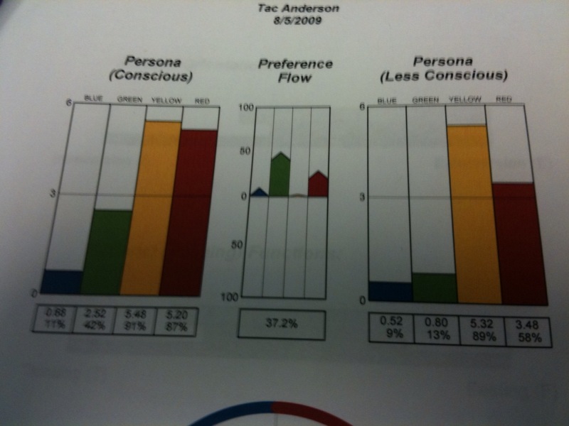 What you see on the right hand side is me in my normal preferred state. Blue is attention to detail/analytical, Green is support and group harmony, Yellow is high energy and extroverted, Red is action and assertiveness.