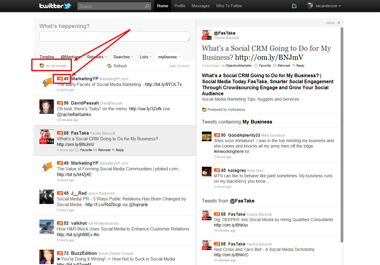 Twitter.com continues to escalate their features in an effort to drive functionality, engagement and profitability through advertising. If you don’t follow thousands of people, there is probably little reason to use a desktop Twitter client like TweetDeck, Seesmic or Hootsuite. But for someone like me there are two new tools that are making Twitter.com a useful discovery tool. My6Sense and Klout.
